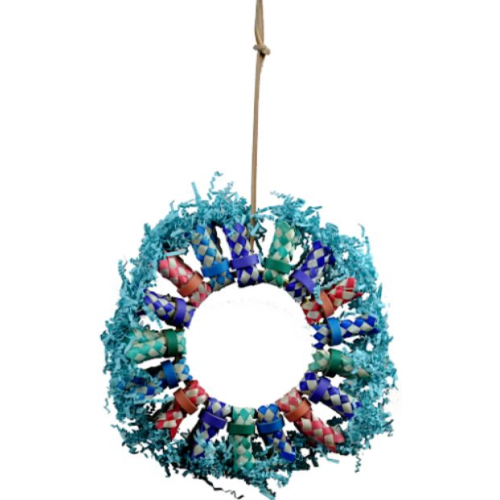 A&E Cage Company Happy Beaks Tropical Punch Cocktail toy is a hanging party for your feathered friend. Bright colors to keep their attention, a paper cup filled with paper and toys for foraging, plastic toys for beak conditioning. You can refill the cup with their favorite toys and treats. So much fun all in one toy!.
